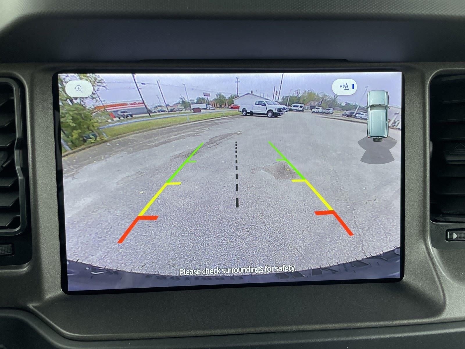 - The vehicle is equipped with a camera that displays an image of the area behind the vehicle on an interior display.
