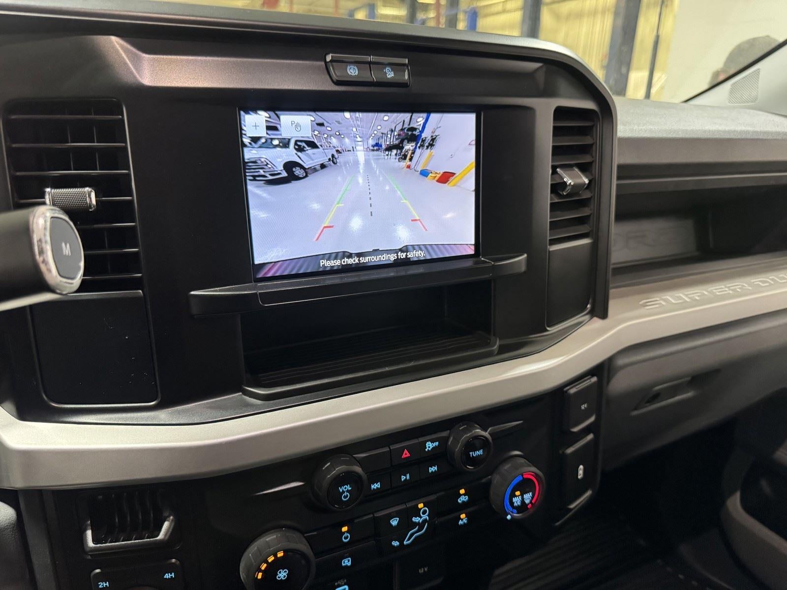 - The vehicle is equipped with a camera that displays an image of the area behind the vehicle on an interior display.